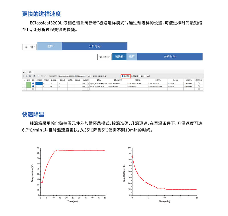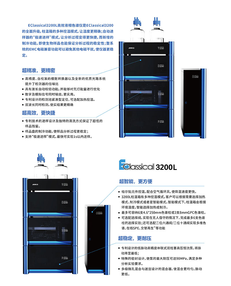 EClassical3200L高效液相色谱仪是EClassical3200的全面升级,柱温箱的多种控温模式,让温度更精确;自动进样器的“极速进样”模式,让分析过程变得更快捷,而新增的制冷功能,即使生物样品也能保证分析过程的稳定性;整系统的EMC电磁兼容功能可以避免其他电磁干扰,使仪器更稳定。